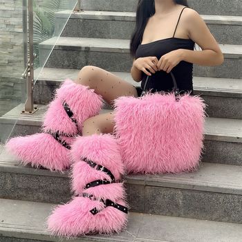Botas de piel estilo cinturón con conjunto de monedero Blanco Púrpura Faux Mongolian Ladies Botas de invierno Rodilla plana Botas y bolsos peludos